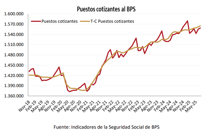 En junio de 2025, la cantidad de puestos cotizantes al BPS fue de 1.555.378. El total de puestos cotizantes fue 1,1% superior al registrado en el mismo mes de 2024. En la comparación mensual, la estimación de la tendencia-ciclo, que aísla los componentes estacionales e irregulares de la serie, aumentó 0,11% respecto al mes pasado.