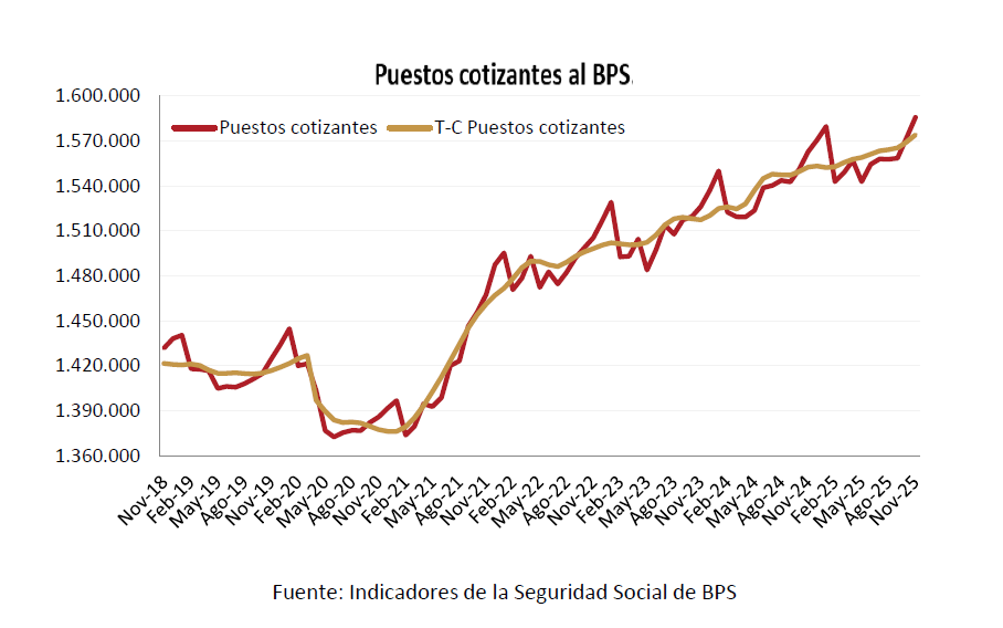En noviembre de 2025, la cantidad de puestos cotizantes al BPS fue de 1.585.125. El total de puestos cotizantes fue 1,5% superior al registrado en el mismo mes de 2024, y aumentó 0,9% respecto a octubre de 2025. En la comparación mensual, la estimación de la tendencia-ciclo, que aísla los componentes estacionales e irregulares de la serie, aumentó 0,3% respecto al mes pasado.