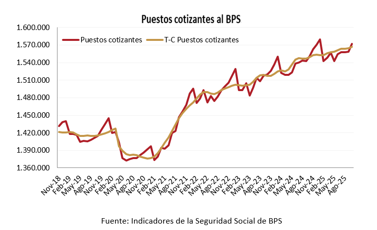 En octubre de 2025, la cantidad de puestos cotizantes al BPS fue de 1.572.158. El total de puestos cotizantes fue 1,4% superior al registrado en el mismo mes de 2024. En la comparación mensual, la estimación de la tendencia-ciclo, que aísla los componentes estacionales e irregulares de la serie, aumentó 0,1% respecto al mes pasado.