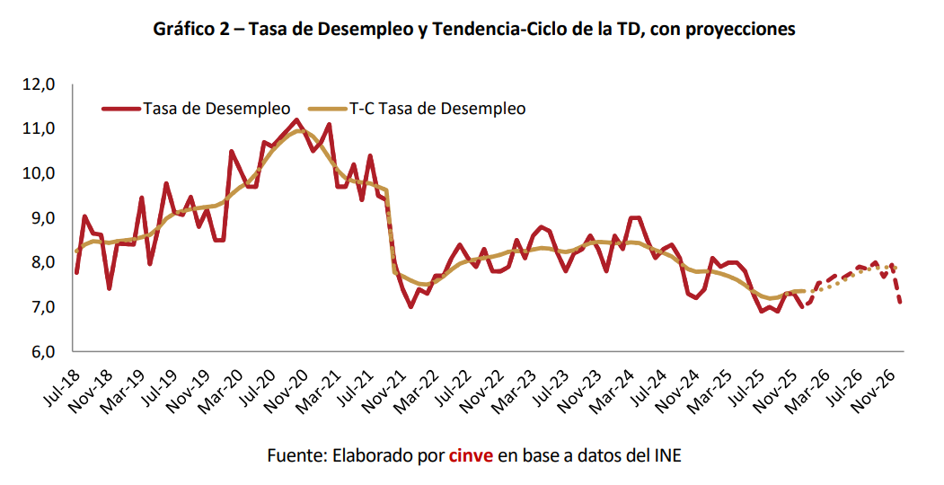 Las estimaciones de cinve muestran que el componente tendencial de la tasa de empleo disminuyó alrededor de 0,04% mientras que el componente tendencial de la tasa de desempleo aumentó 0,14% con respecto al mes anterior.