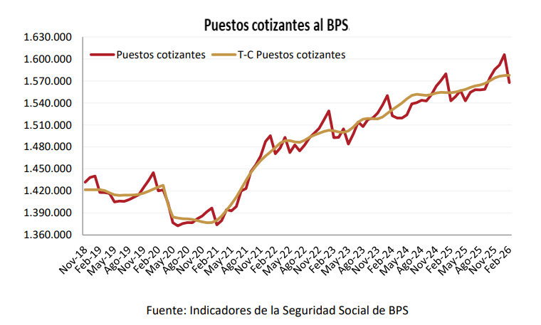 En febrero de 2026, la cantidad de puestos cotizantes al BPS fue de 1.567.611. El total de puestos cotizantes fue 1,6% superior al registrado en el mismo mes de 2025, y disminuyó 2,4% respecto a enero de 2026. En la comparación mensual, la estimación de la tendencia-ciclo, que aísla los componentes estacionales e irregulares de la serie, se mantuvo incambiada respecto al mes pasado.